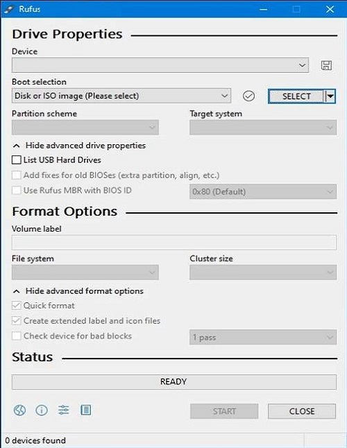 Arendszerindító USB elkészítésének folyamata rendkívül áttekinthető. Először is csatlakoztatni kell a számítógéphez a használni kívánt USB-meghajtót. A Rufus használatakor az elindítása után automatikusan felismeri azt a listából. Ezt követően ki kell választani a létrehozni kívánt ISO-lemezképet. A program lehetővé teszi a partíciós séma, MBR vagy GPT és a célrendszer BIOS/UEFI beállítását. A fájlrendszer megadását, a legtöbb esetben az alapértelmezett beállítások megfelelőek. A pendrive-on lévő összes adat törlődik, a szoftver megformázza az eszközt.